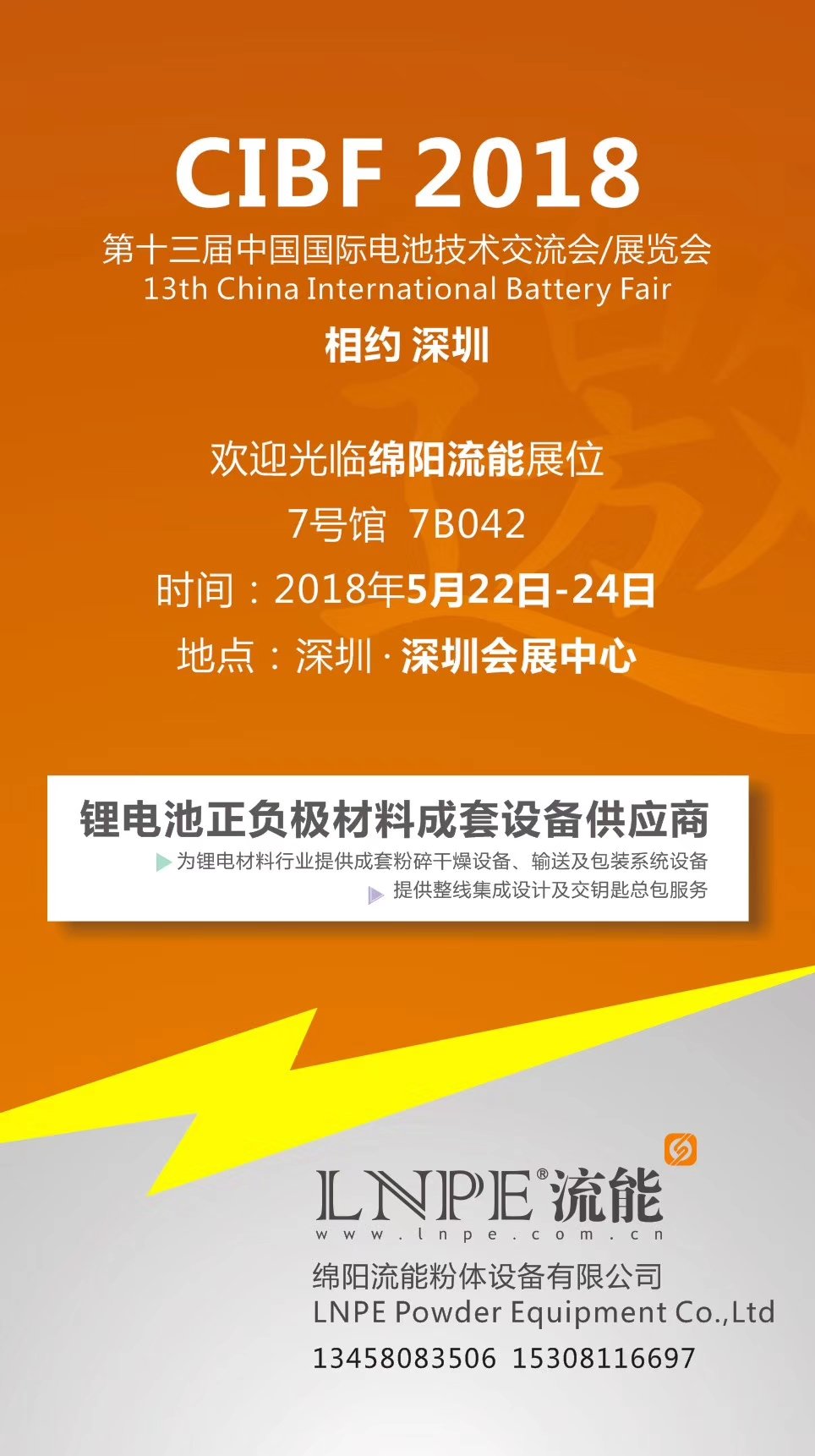 中国化学与物理电源行业协会定于2016年5月24日~26日在深圳会展中心举办规模空前的“第十二届中国国际电池技术交流会/展览会(CIBF2016)”。 绵阳流能粉体设备有限公司Mianyang Liuneng Powder Equipment Co.,Ltd展位号:7G155,7G156。届时会展示